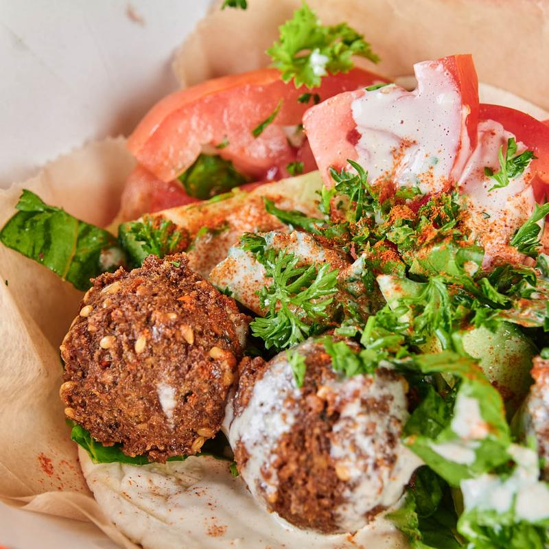 Falafel, lettuce, tomatoes, cucumber, tahini sauce, and parsley